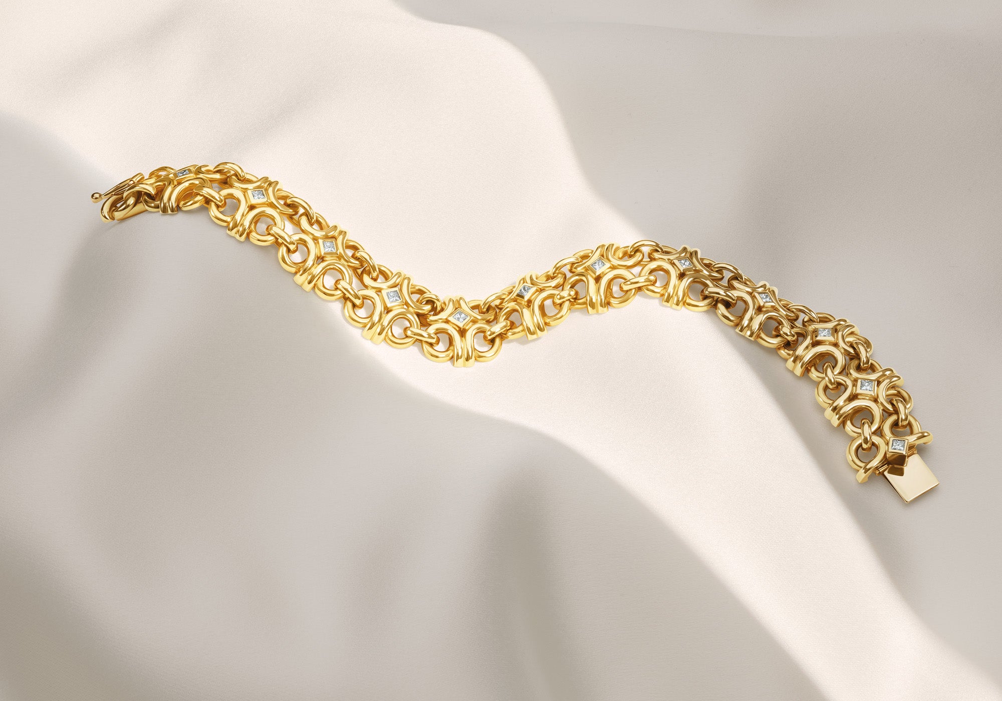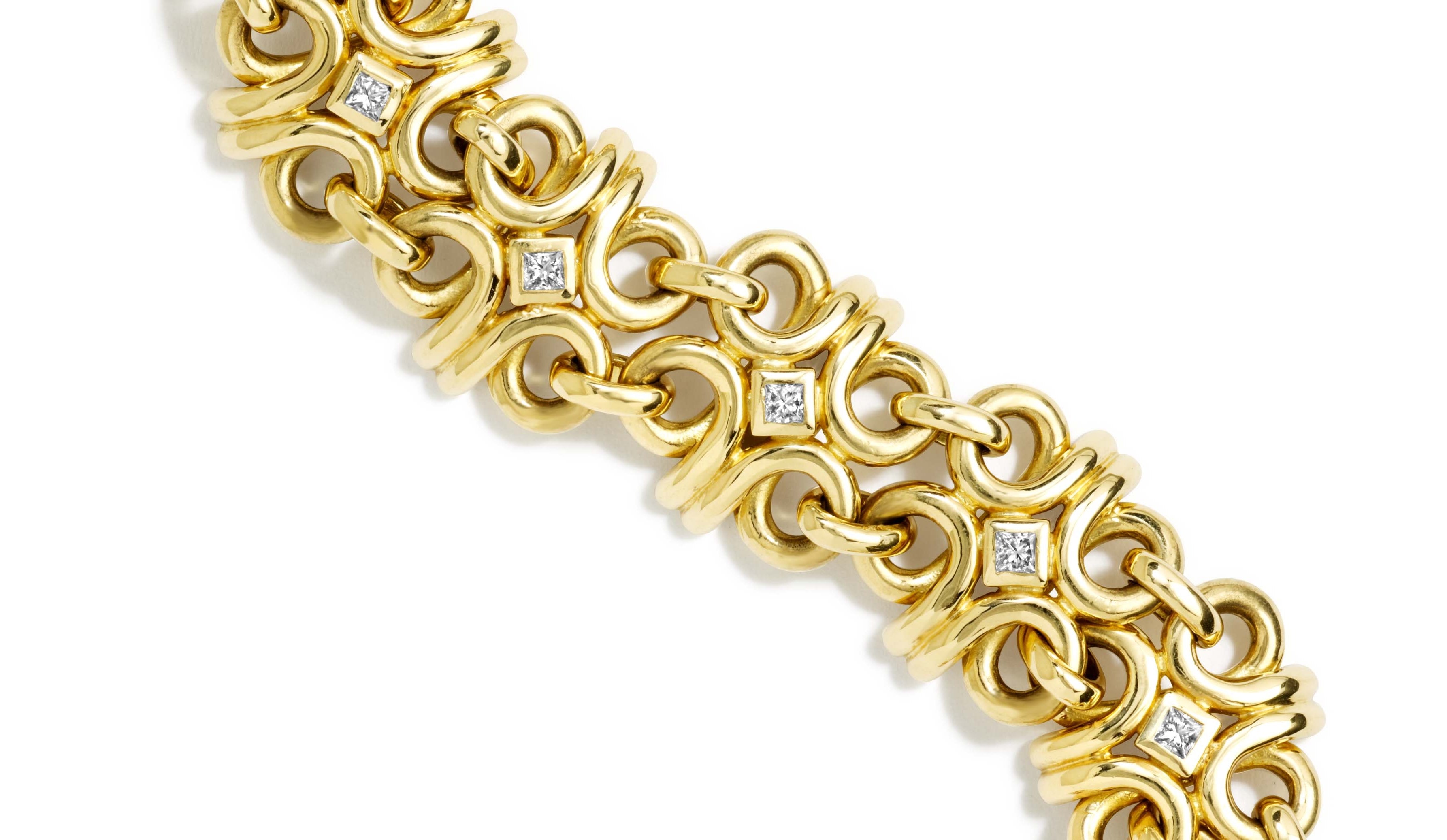 Curls of golden strands intertwine and weave together gold and square cut diamonds in the Beatrice bracelet.